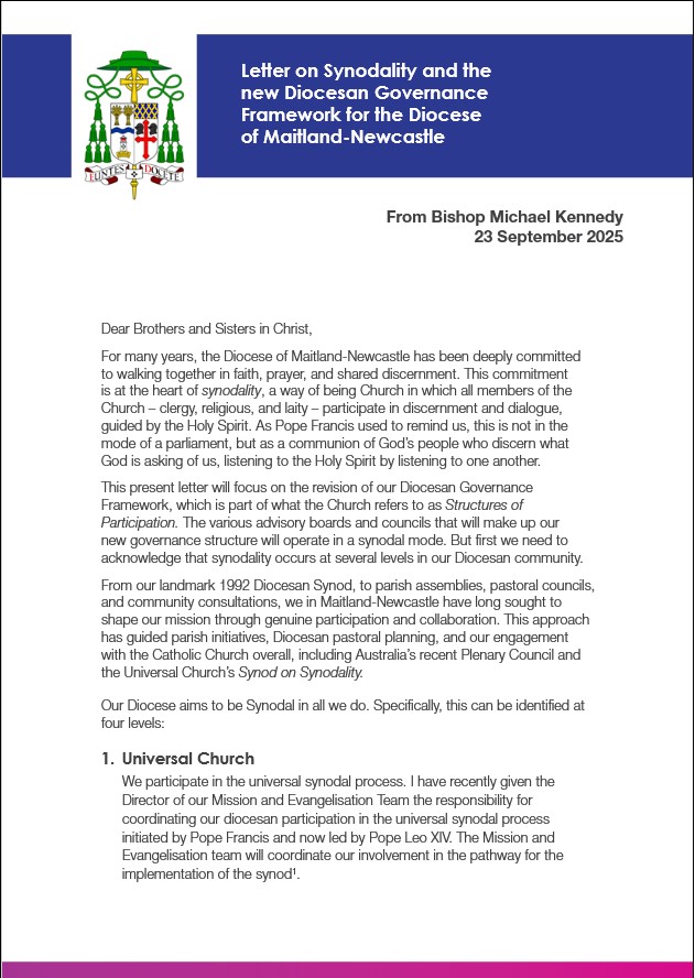 To read the full letter: https://mn.catholic.org.au/news/letter-from-bishop-michael-kennedy-on-synodality-and-the-new-diocesan-governance-framework-for-the-diocese-of-maitland-newcastle/